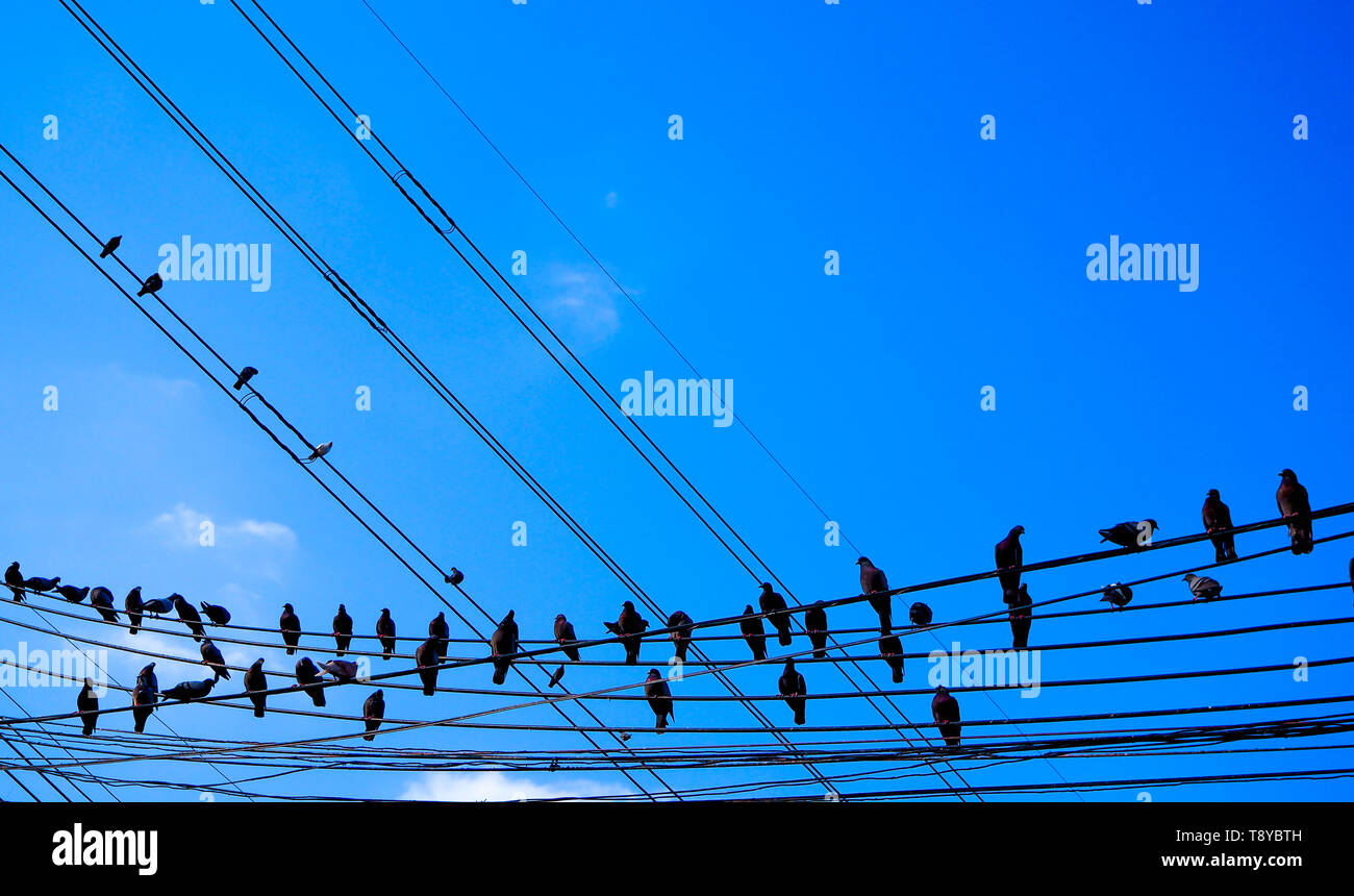 Vogel Uber Power Line Kabel Gegen Den Blauen Himmel Mit Wolken Hintergrund Vintage Retro Instagram Filter Stockfotografie Alamy