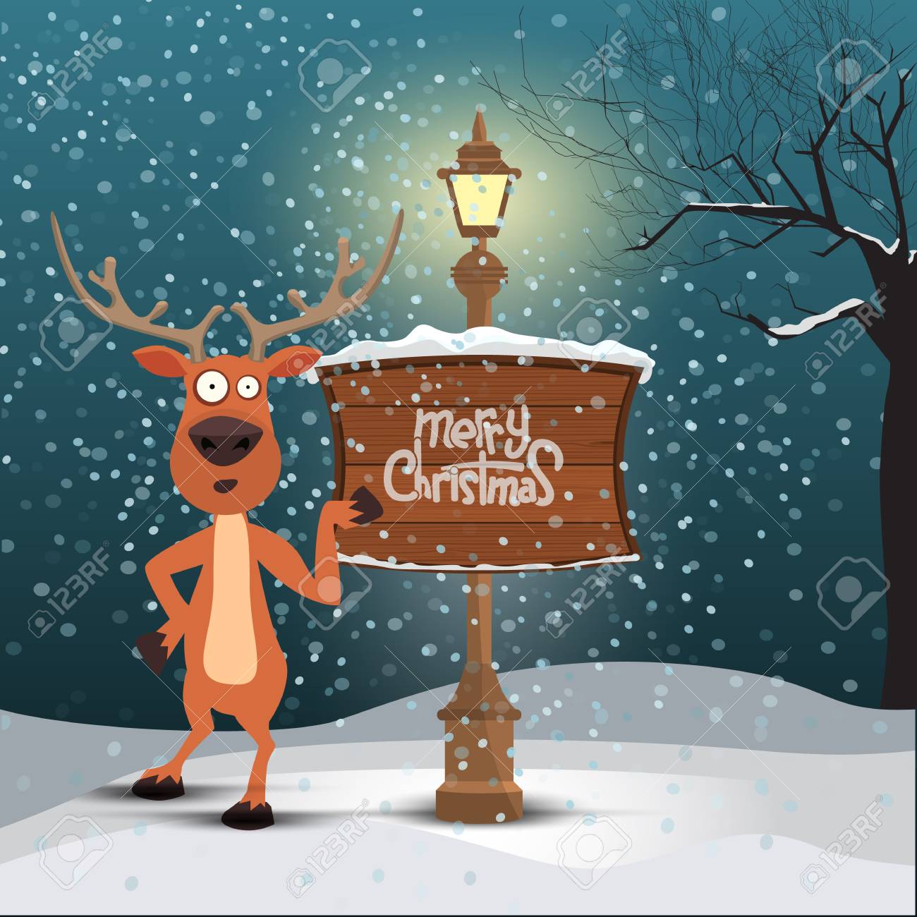 Weihnachtsgrusskarte Verschneite Winter Hintergrund Weihnachten Rentier Mit Merry Christmas Kalligraphie Auf Holzplatte Zu Unterzeichnen Lizenzfrei Nutzbare Vektorgrafiken Clip Arts Illustrationen Image 67091662